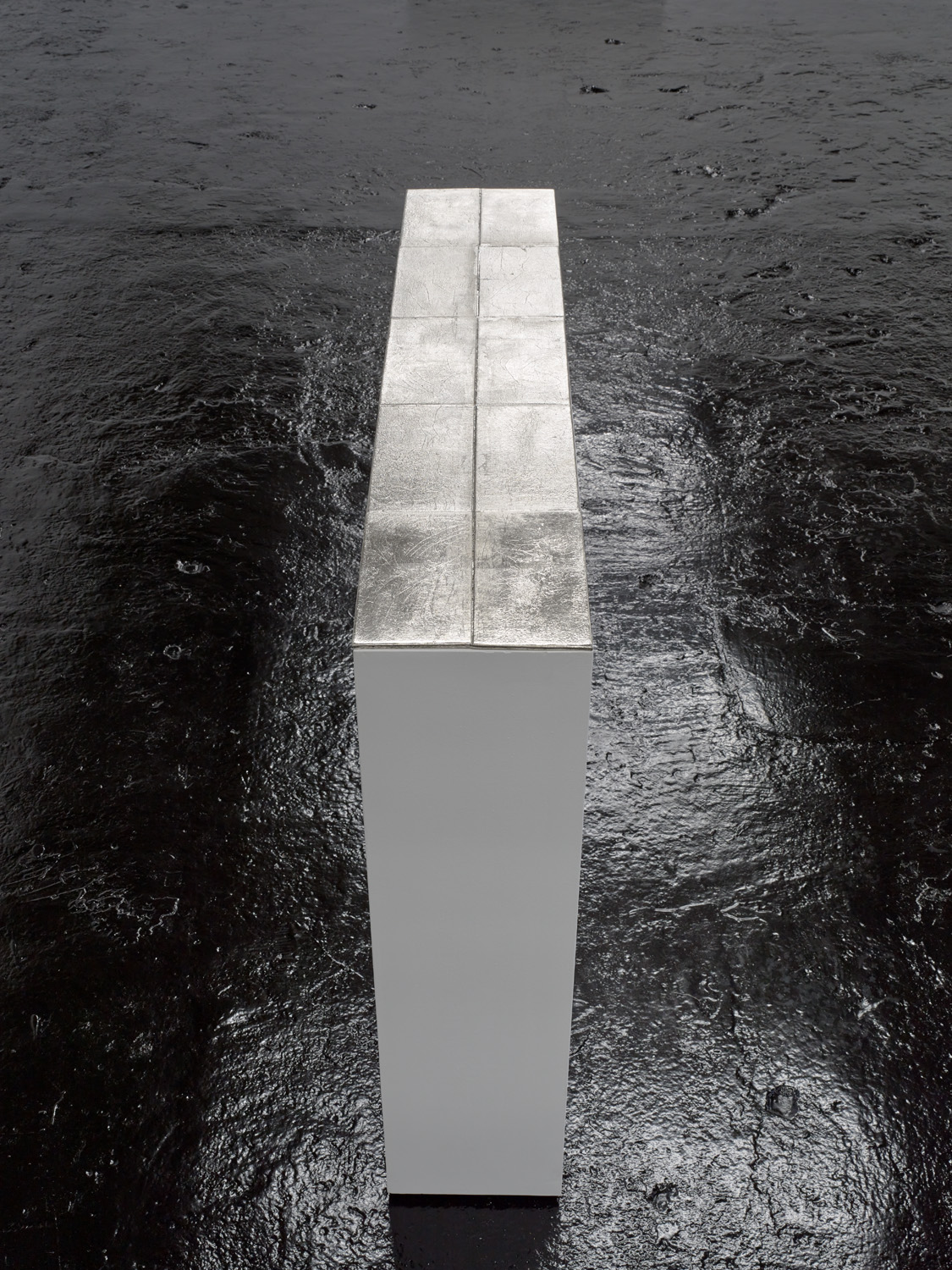 - Untitled, 2023, tin leaf on metal, 2 x 105 x 20 cm, Installation view, Rue des Béguines, Brussels. Photography: Kristien Daem